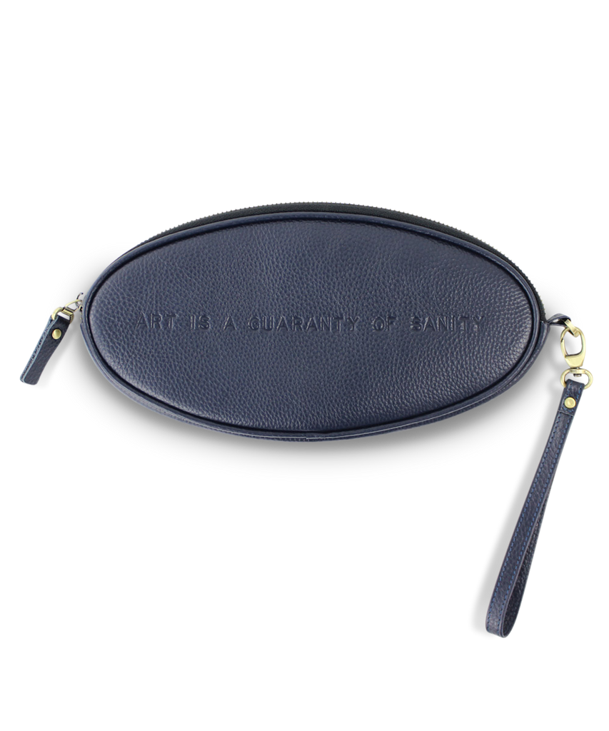 -Genuine Leather Clutch with "ART IS A GUARANTY OF SANITY" embossed into front of leather and cotton lining featuring pattern work from the artist.